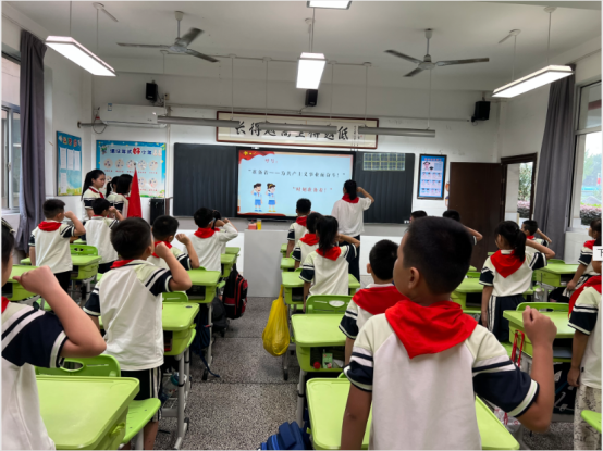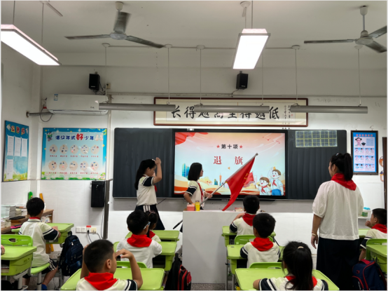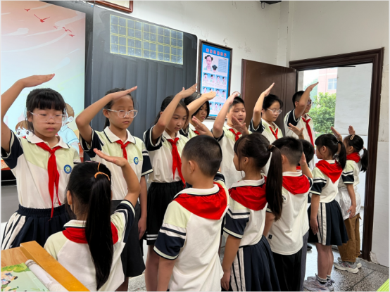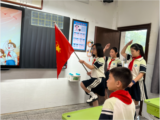 随后,激昂的出旗曲响起,全体师生肃立,少先队员敬队礼,目光紧随队旗,展现了队员们昂扬的精神风貌。在飘扬的队旗下,队员们高唱《中国少年先锋队队歌》,“我们是共产主义接班人……”的嘹亮歌声在教室里回荡,表达了孩子们立志继承革命先辈光荣传统的决心。