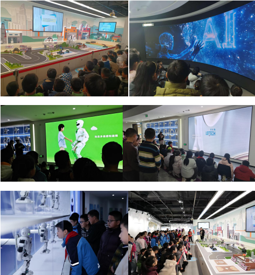 讲座结束,同学们走进科技展览区,开启45分钟的探索之旅。各类前沿的AI展品、互动装置让大家目不暇接,大家一边参观一边讨论,时不时停下脚步仔细观察,在惊叹科技魅力的同时,也在心中埋下了探索科学的种子。