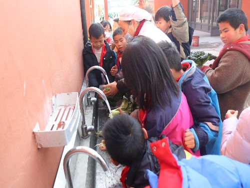 随后,在食堂阿姨的带领下,同学们有序开展洗菜工作:认真清洗蔬菜上的泥土,仔细摘除黄叶,动作虽略显笨拙,却格外认真。食堂阿姨一对一的细致指导,让小班里的每位同学都能清晰掌握洗菜技巧,在实践中提升了生活自理能力。