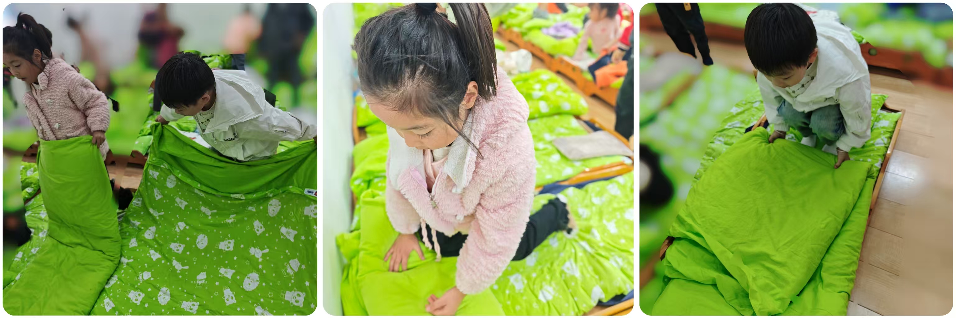我没直接帮忙,而是指了指彤彤的动作:“你看彤彤是先把被子的边对齐床沿哦。” 轩轩点点头,目光落在彤彤身上 —— 只见彤彤先把被子铺平,让四个角都对齐床垫的角,再把被子上下对折。轩轩立刻转回自己的床,学着把被子的四个角往床垫角上 “凑”,虽然对齐时调整了 3 次,但终于让被子平平整整地铺在了床上。